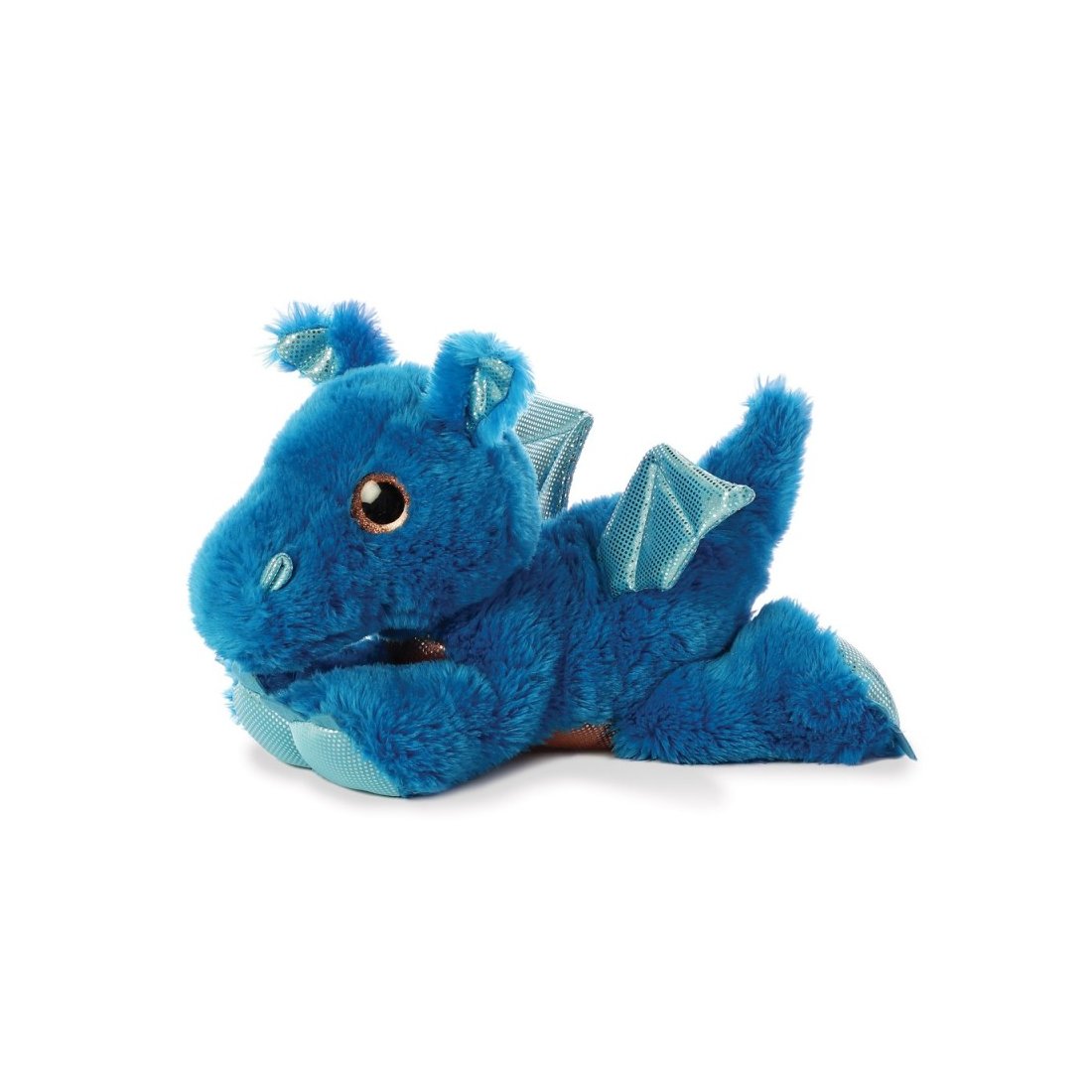 Der große blaue Sparkle Tales Drache Flash mit den großen orangeroten Glitzeraugen ist kuschelig weich und teilweise mit Beans gefüllt. Innenohren, Nüstern und die kleinen Flügelchen auf dem Rücken sind aus türkisem Stoff mit silbernen Glitzerpünktchen. Bauch und Fußsohlen sind aus kupferfarbenem Glitzerstoff.