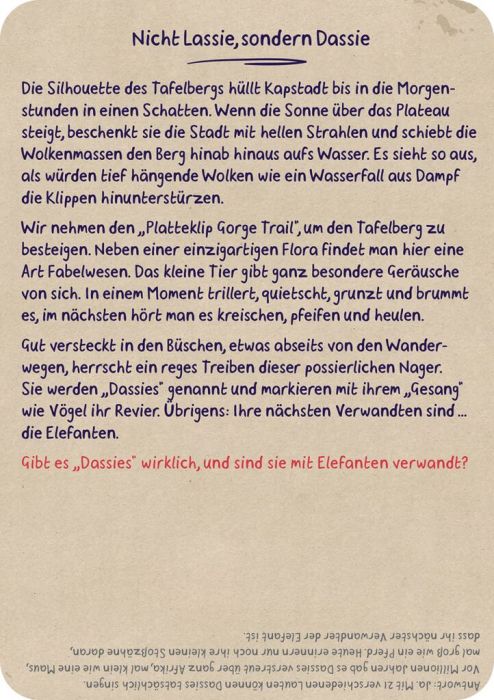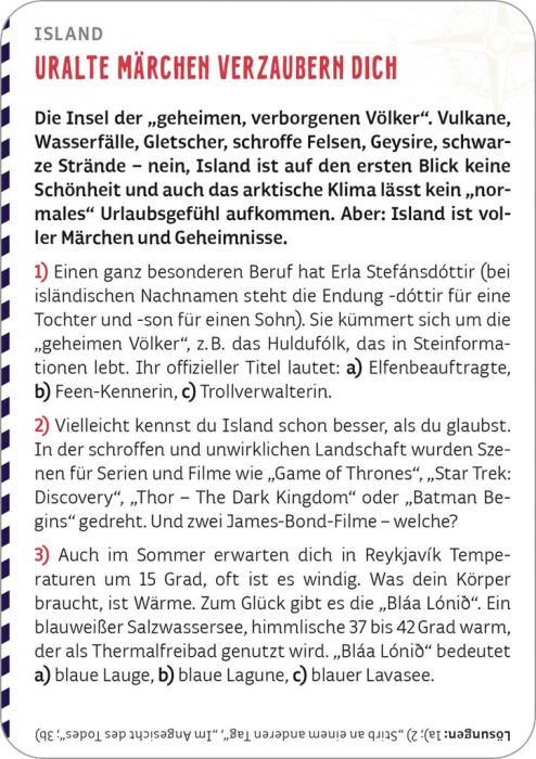 Auf den Karten finden sich neben spannenden Quizfragen zum Rätseln auch informative Texte zum Schmökern. 15 der insgesamt 100 Karten kommen als Urlaubspostkarten daher, auf denen Weltenbummler Maurice unglaubliche Geschichten von seinen Reisen erzählt – und dabei gerne mal flunkert. Es gilt zu entscheiden: Stimmt das Erzählte oder wurden die Abenteuer mit falschen Fakten ausgeschmückt? Die tollen Urlaubsfotos auf allen Karten runden das Quiz ab und sorgen dafür, dass man sich fühlt, als wäre man direkt vor Ort in Island, Las Vergas oder aufBali. Die ideale Beschäftigung für den Urlaub auf „Balkonien“ und ein tolles Geschenk für leidenschaftliche Globetrotter!