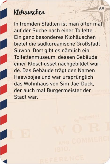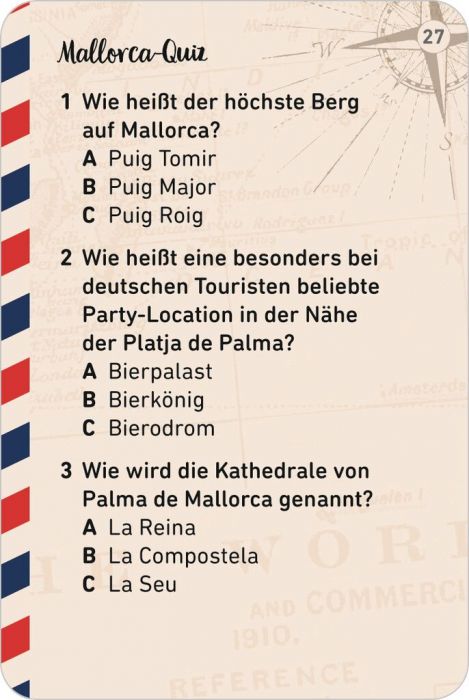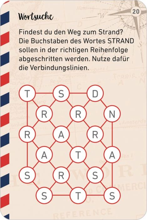 Mallorca, Kuba, Mexiko – bei dem Gedanken an ferne Länder, warme Temperaturen und weiße Sandstrände kommen wir doch alle ins Schwärmen und Träumen. Auch die Box „Rätseln, Raten und Relaxen“ bringt jeden sofort in den Urlaubsmodus. Vollgepackt mit Fernweh-Rätseln, Quizfragen, Reisetipps und unglaublichen Fakten aus aller Welt sorgt sie für kurzweilige Unterhaltung. Wenn im Flugzeug etwas Reisezeit überbrückt werden soll, sind die 75 Karten für Reiselustige das richtige Mittel der Wahl. Während getüftelt und gerätselt wird, was das Zeug hält, vergeht die Zeit wortwörtlich wie im Fluge und man erreicht das Urlaubsziel im Nullkommanichts. Auch als etwas andere Strandlektüre oder für den kleinen Kopfurlaub zu Hause ist diese Box perfekt geeignet.