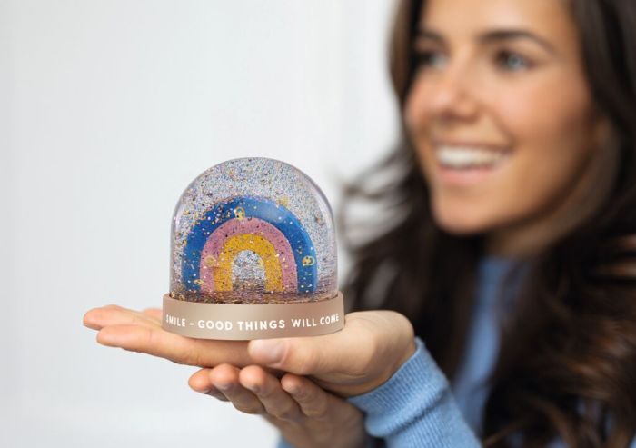 Smile – und schon kann der Tag richtig gut starten! Einfach die Schneekugel schütteln und schon tanzt ein fröhlicher Smiley- und Glitzerregen um einen bunten Regenbogen herum. Der Schriftzug sagt alles: "Good things will come!"