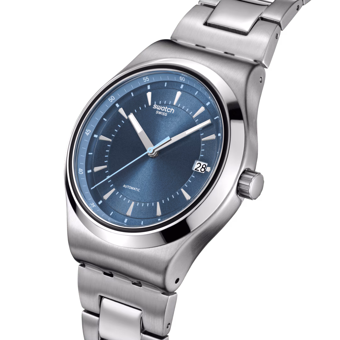 Diese elegante Automatikuhr verfügt über ein blaues Zifferblatt mit Sonnenschliff, silberfarbene fluoreszierende Indizes, Stunden- und Minutenzeiger, einen hellblauen Sekundenzeiger, einen hellblauen Außenring mit weißer Minutenteilung sowie ein weißes Datumsfenster mit schwarzem Print bei 3 Uhr. Das Gehäuse aus gebürstetem Edelstahl wird durch eine Lünette aus glänzendem Edelstahl ergänzt und gibt durch den Gehäuseboden mit Digitaldruck den Blick auf das SISTEM51-Uhrwerk frei. Abgerundet wird der Look durch ein Edelstahlarmband mit gebürstetem und poliertem Finish sowie einer Schmetterlingsschließe.